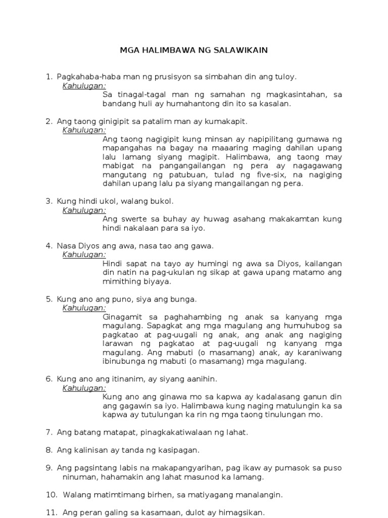Kung maikli ang kumot matutong mamaluktot. May lumang kasabihan na kung ano ang puno ay siya rin ang bunga. Halimbawa kung ang isang bata ay pilyo o hindi kagandahan ng ugali ang sasabihin ay kung ano ang puno siya ang bunga.